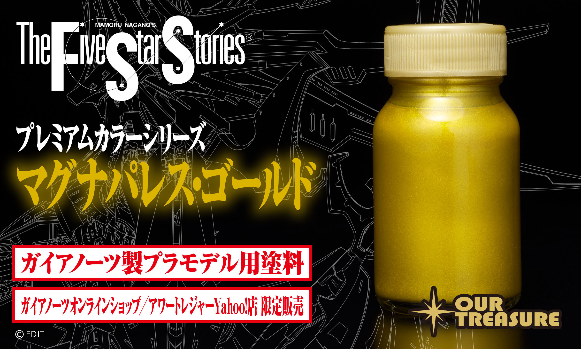 F.S.S.で多くのメーカー完成見本を手がけてきたプロフィニッシャー小堀剛佑氏が永野護氏監修のもと、ガイアノーツ社とともに『帝騎マグナパレス ザ・ナイト・オブ・ゴールド』用のゴールド塗料を開発。貴重な原料などを入手することで今まで表現できなかった色を作り上げる、ガイアノーツ社珠玉のプレミアムシリーズで商品化しました。
