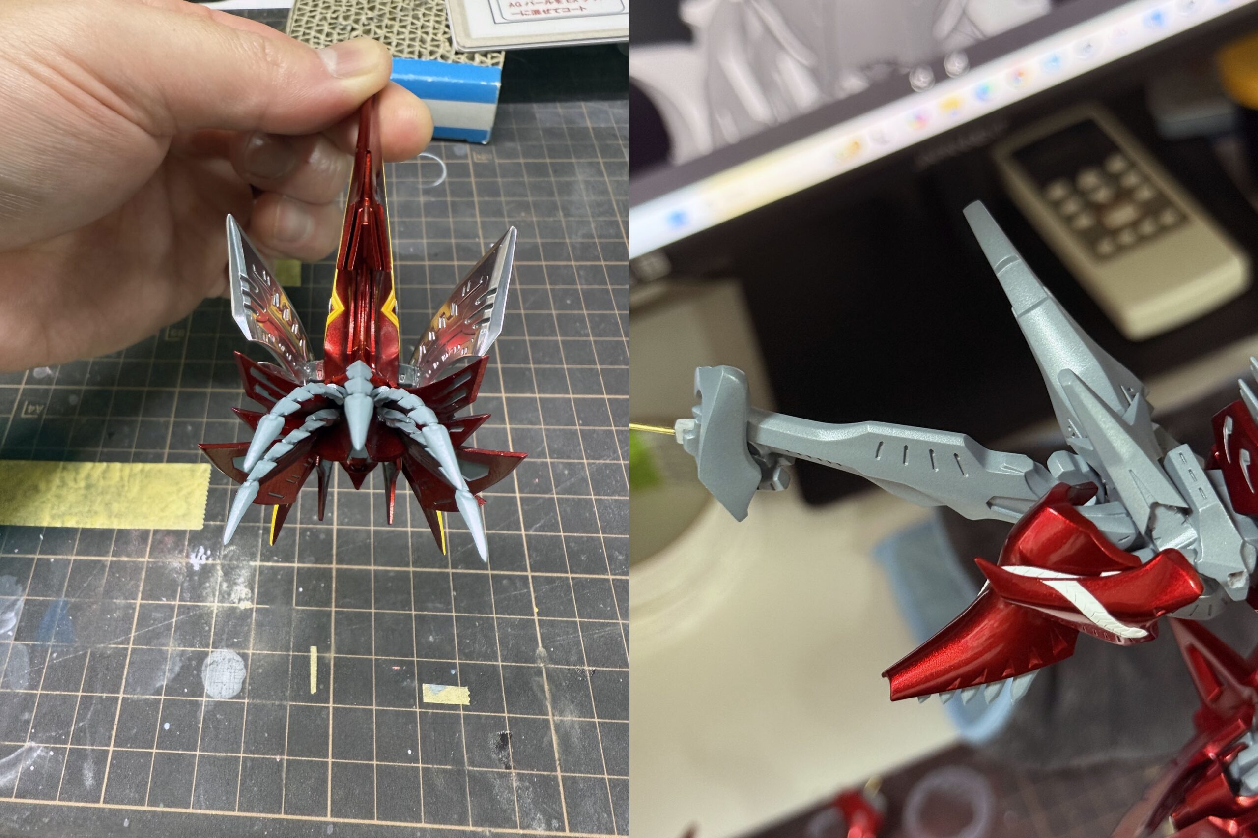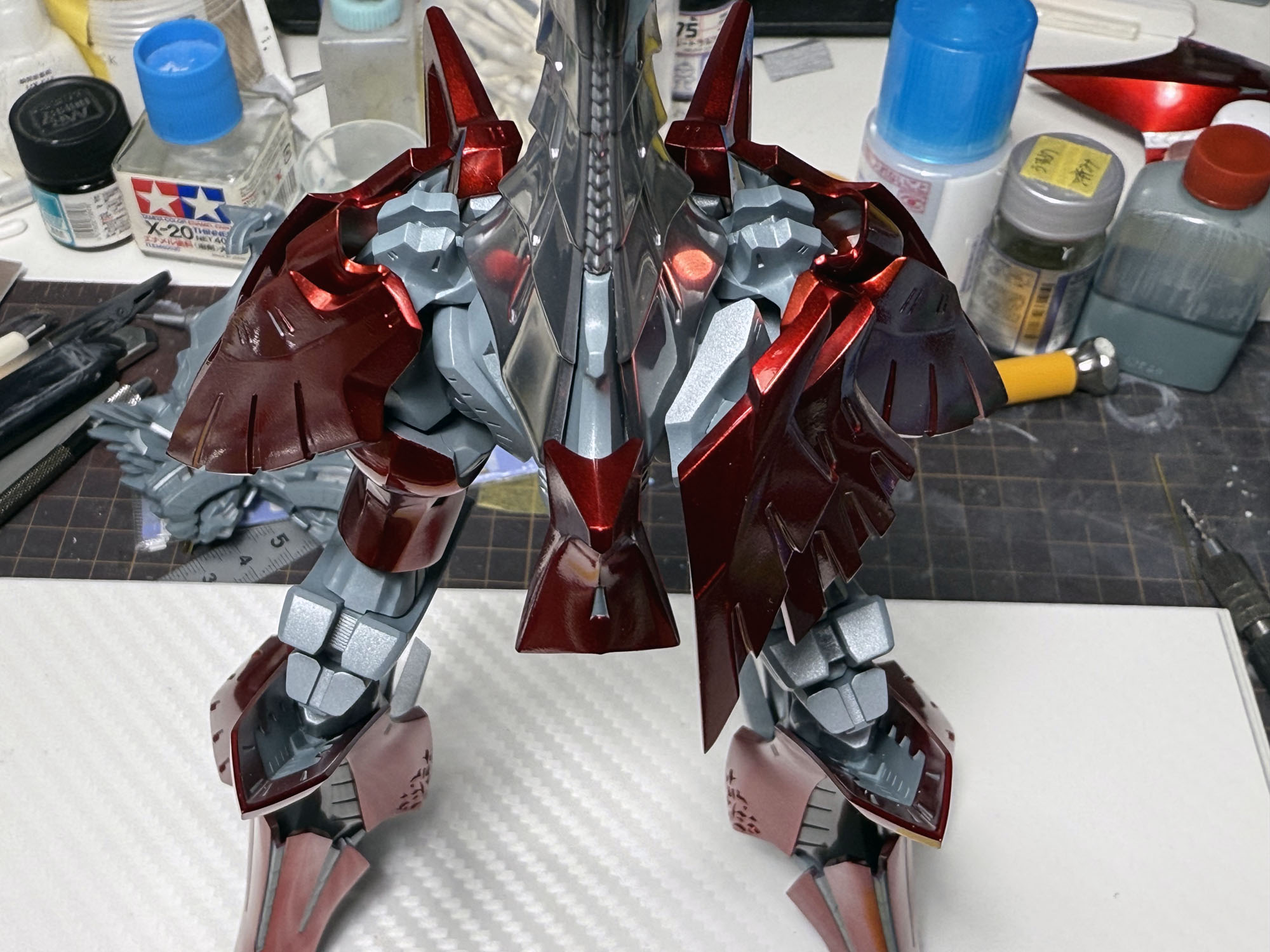 先生のおっしゃったイメージには、フレーク状の金属表現の上から、単純な赤ではないクリアー塗料を吹き分けて、層に分けて塗装して仕上げていくと解釈しました。